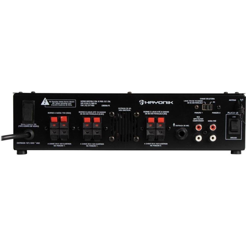 Saídas: Bornes 4 Ohms, 0,8 Ohms, 70V
