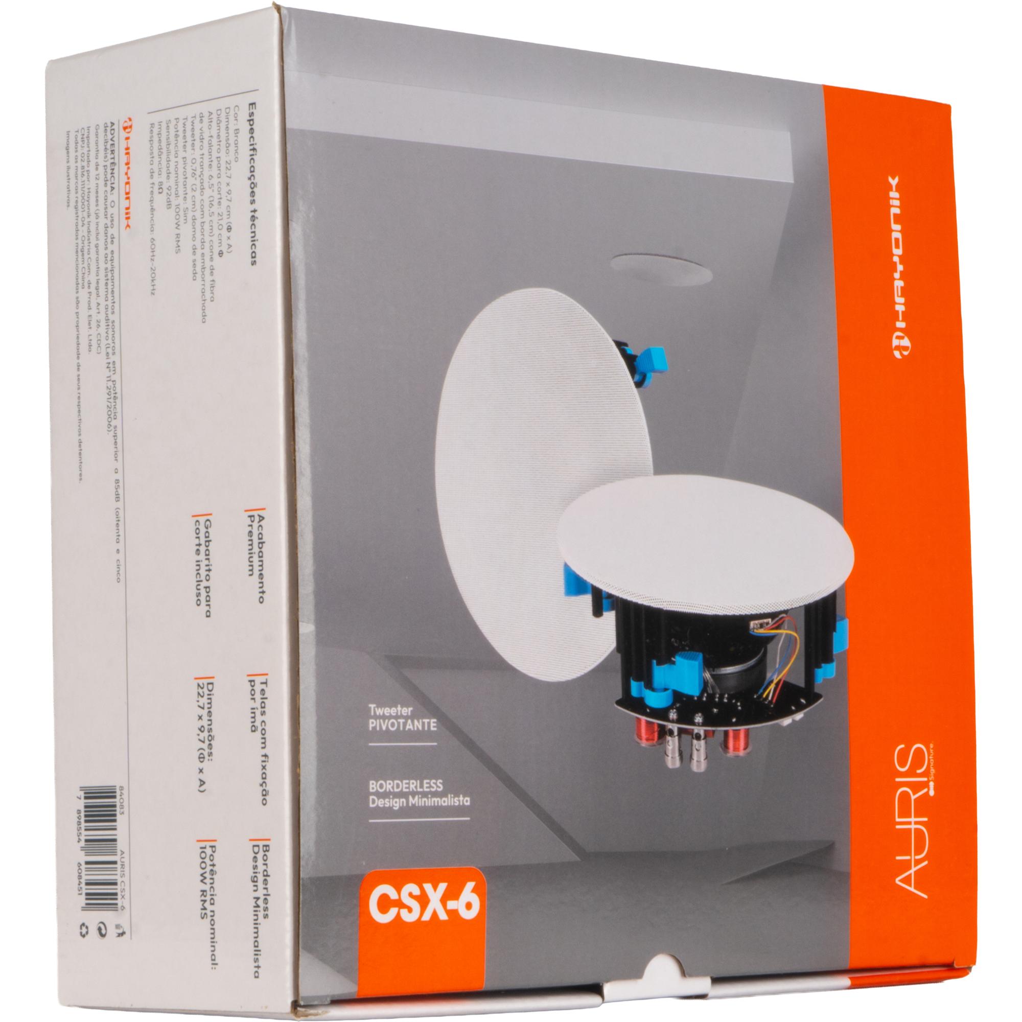 Suas telas, com fixação por ímã, garantem praticidade na instalação e manutenção, enquanto o cone em fibra de vidro trançada oferece durabilidade e excelente desempenho sonoro. Outro diferencial dessa linha é o design borderless, com acabamento premium, este modelo se torna ideal para projetos arquitetônicos que exigem discrição e elegância. A facilidade de aplicação torna a Auris CSX-6 uma escolha indispensável para quem deseja aliar tecnologia e beleza em seus espaços.
