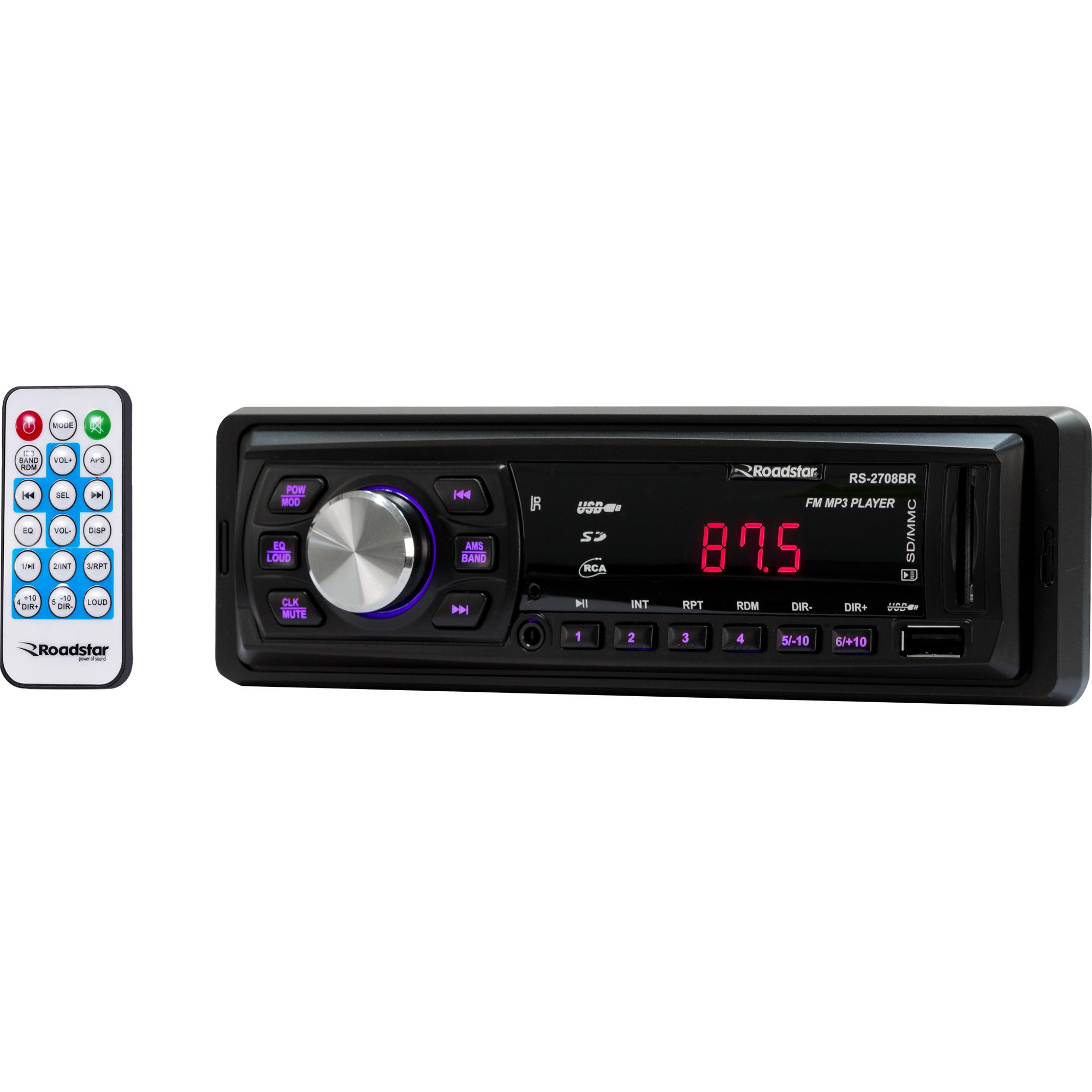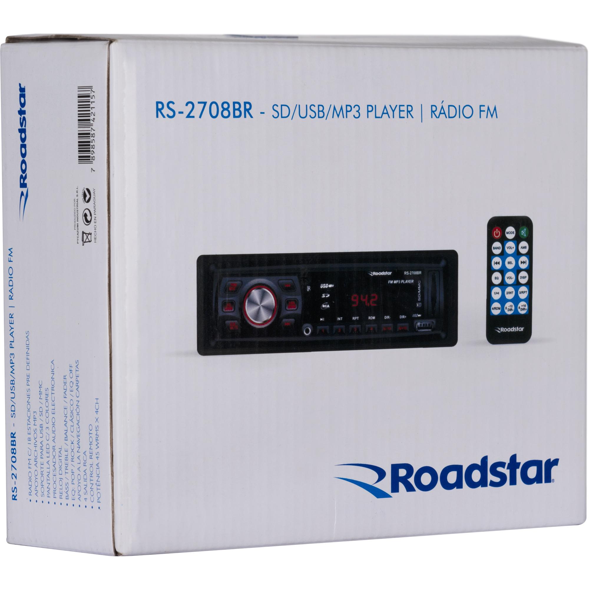 O RS2707BR da ROADSTAR, deixa seu automóvel muito mais aconchegante e com todo astral. Agora suas músicas favoritas podem ser ouvidas no trânsito, viagens, e passeios. Possui entrada auxiliar frontal, cartão SD, USB e Rádio FM.