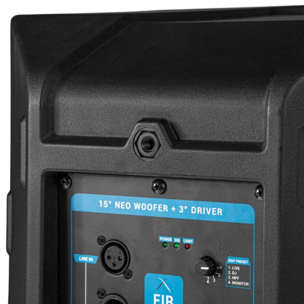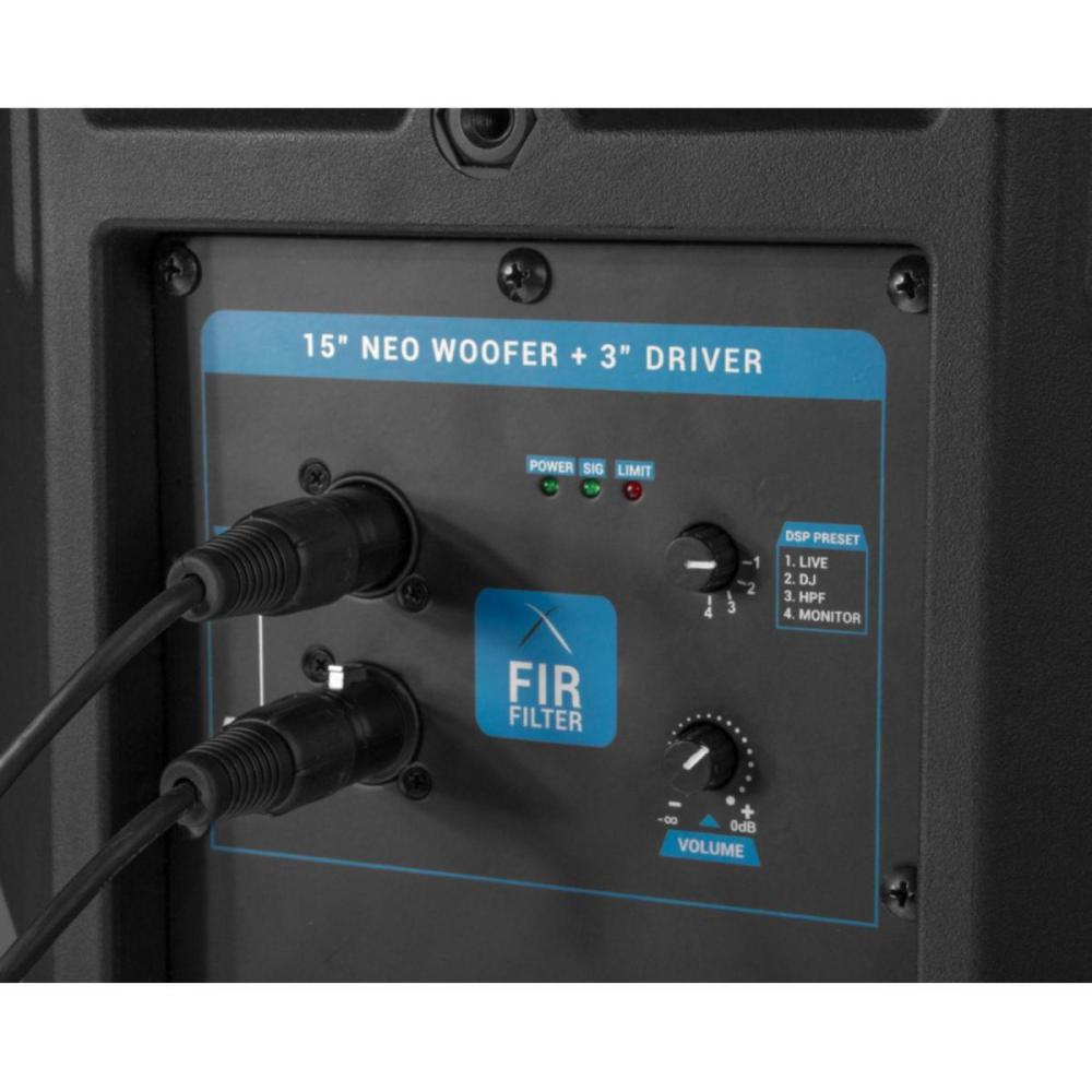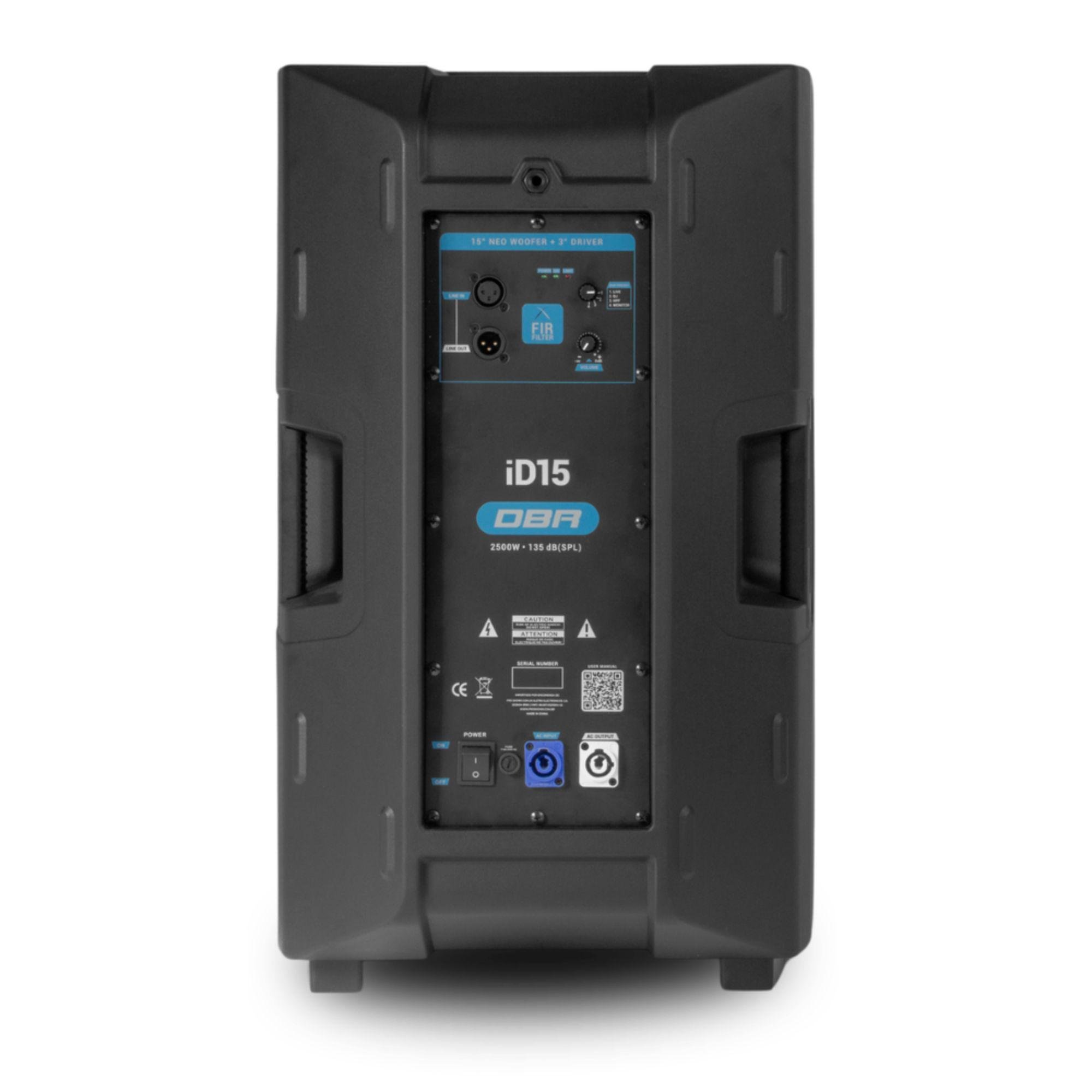 Equipada com woofer de neodímio de 15" e driver de 3" customizado, a DBR ID15 combina desempenho e durabilidade. A tecnologia FIR Filter elimina artefatos indesejados no corte de frequência, enquanto o DSP integrado de 56 bits/192kHz, desenvolvido na Alemanha, processa o áudio com altíssimo padrão, oferecendo som limpo, equilibrado e agradável em qualquer volume.