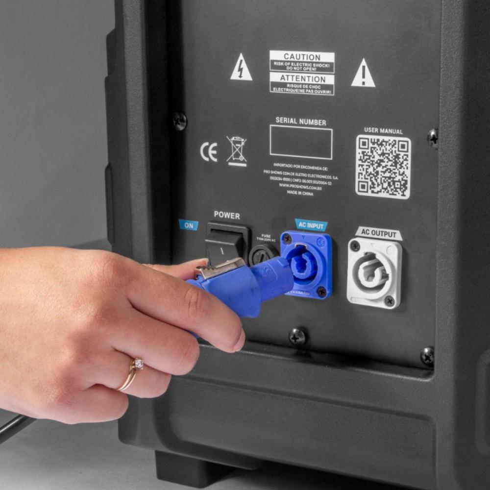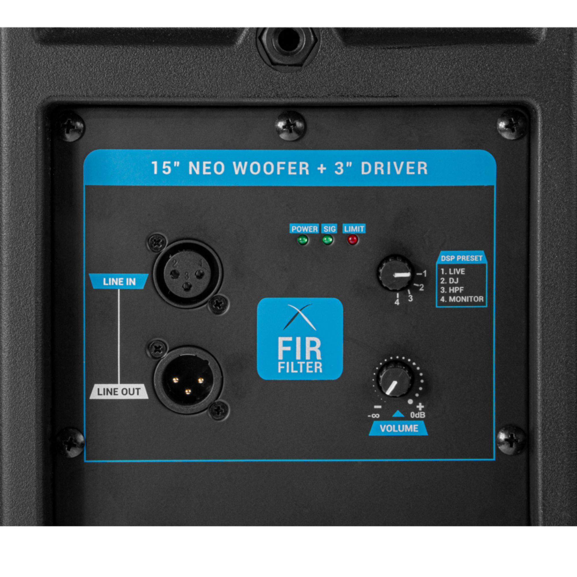 - Componentes: Alto falante de 15 polegadas de neodímio + driver HF de 3" /