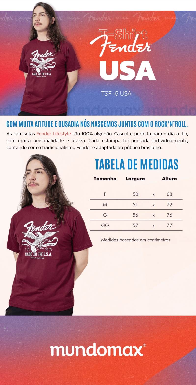 As camisetas Fender Lifestyle são100% algodão. Casual e perfeita para o dia a dia, com muita personalidade e leveza.
