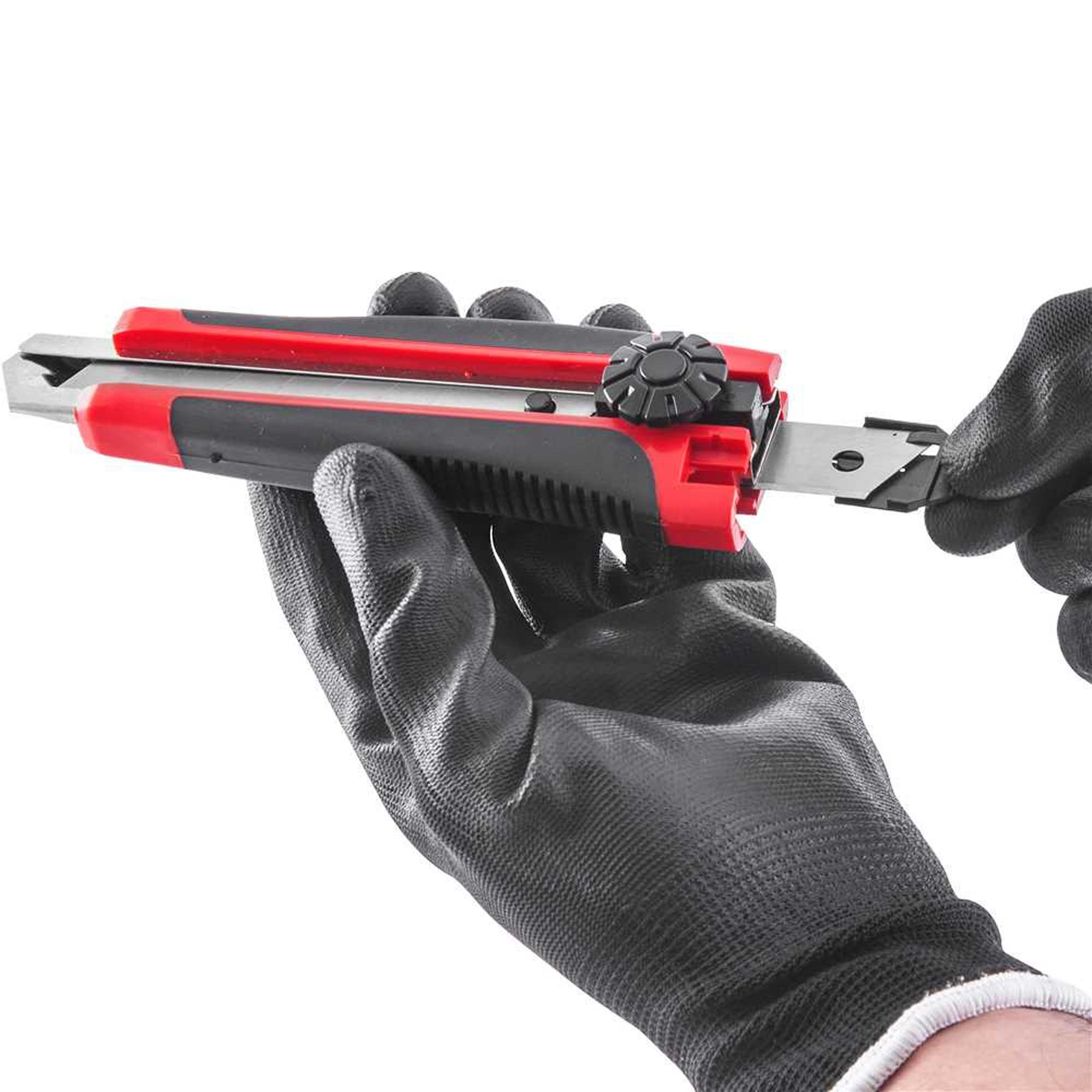 O Estilete Largo 18mm Emborrachado é uma ferramenta de corte resistente com uma lâmina larga de 18 mm. Seu corpo possui revestimento emborrachado para maior conforto durante o uso. Possuindo guia metálica, botão parafuso "giratório" para travar a lâmina e um compartimento com uma lâmina sobressalente, este modelo se torna ideal para cortes precisos no geral, oferecendo maior aproveitamento da lâmina.
