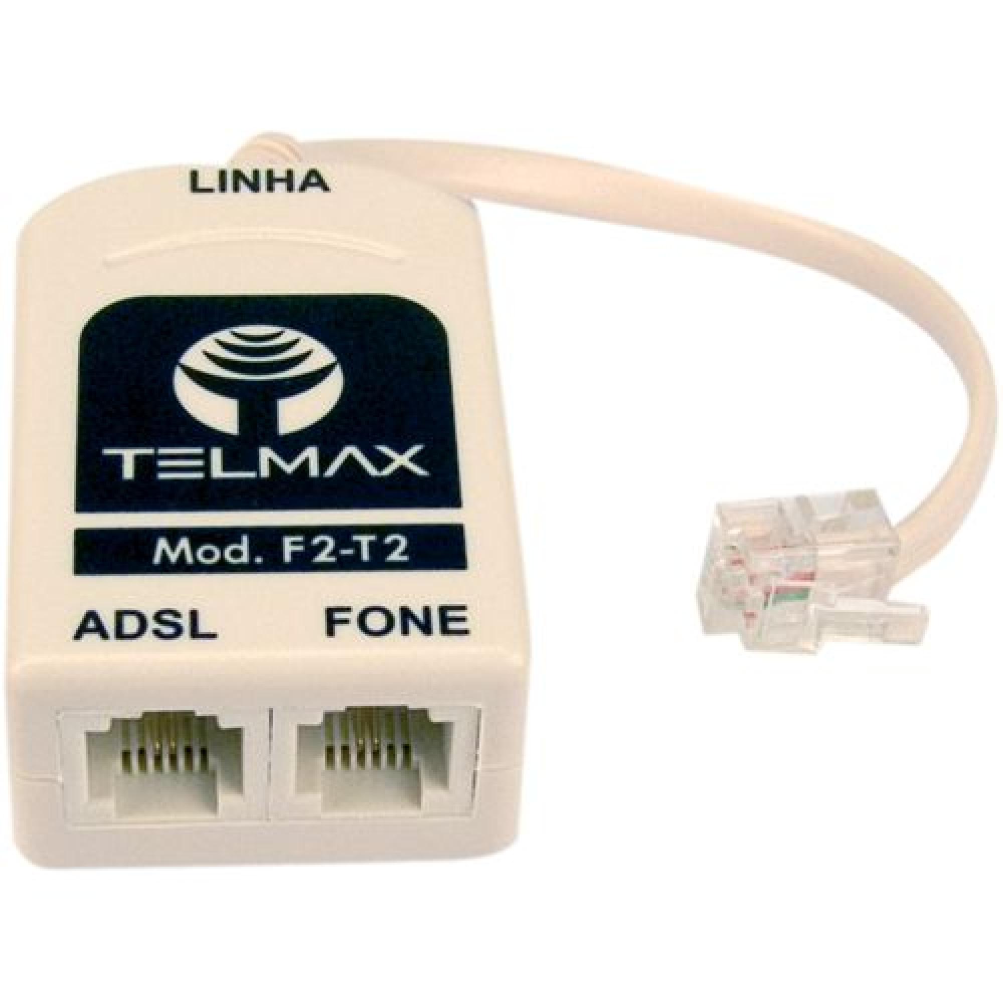 O filtro para ADSL TELMAX modelos F2-T2 possui entrada padrão RjII macho na parte posterior do produto e saída de filtrada padrão RjII fêmea, na parte fontral, sendo uma para o telefone e outra para o modem