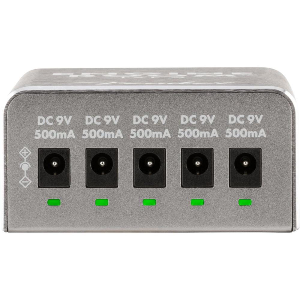 Apresenta 5 tomadas de energia isoladas com aterramento, cada tomada fornece 9V CC a 500mA para manter o desempenho de seus pedais no pico.