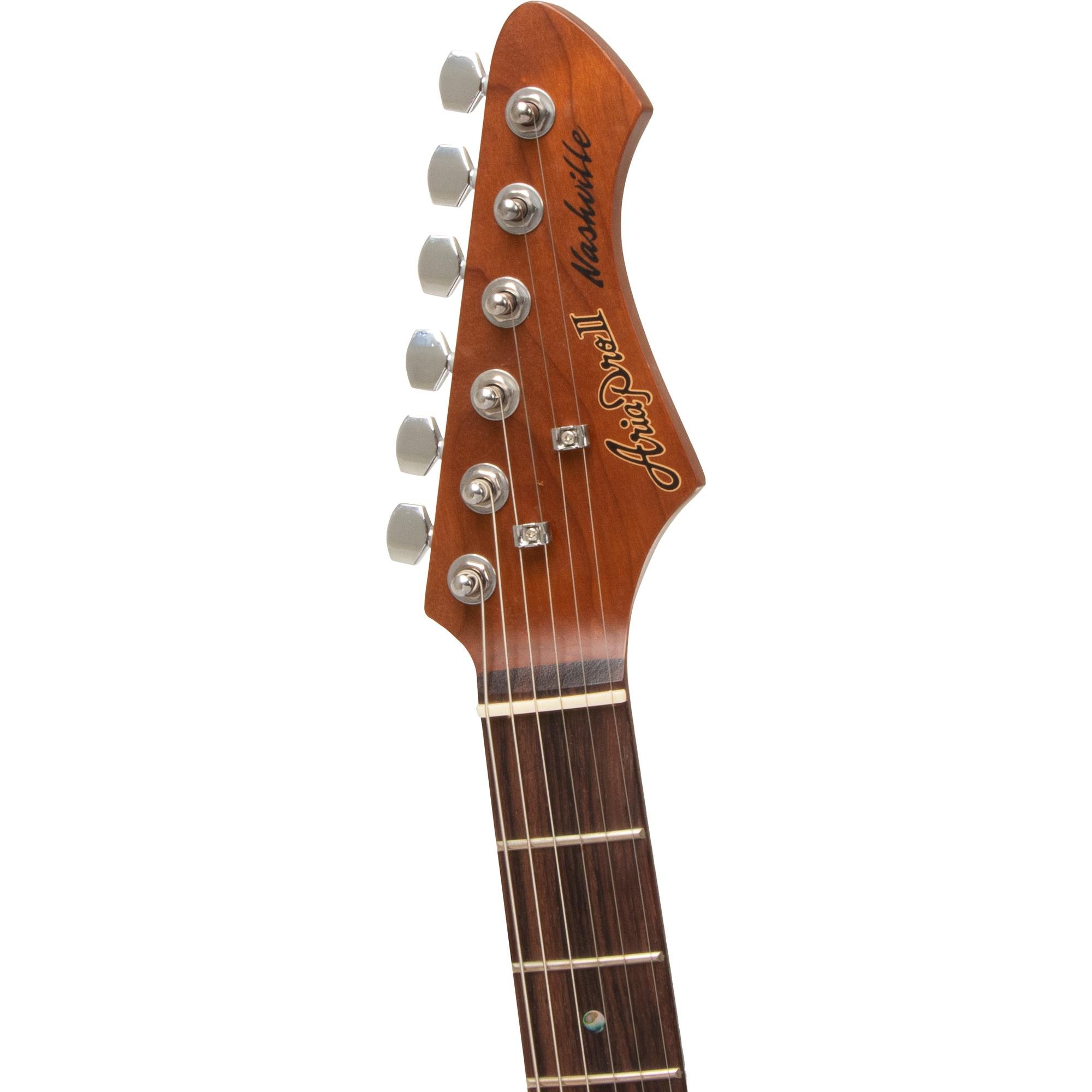 A Guitarra Aria Pro II 615-WJ Nashville é um modelo incrível, possuindo acabamento em preto brilhante, projetada para guitarristas que procuram um instrumento versátil com um visual clássico. O corpo da guitarra é feito de Poplar, proporcionando um som quente e encorpado, enquanto o braço em Maple com escala em Rosewood oferece uma sensação confortável e suave ao tocar.