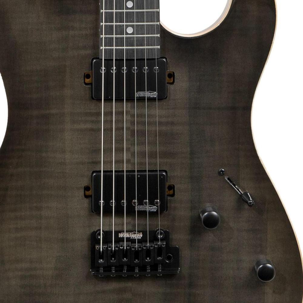 A Benson Hardy Series S Modern é a guitarra que reúne elegância, conforto e versatilidade em um design impressionante. Seu corpo em Mahogany oferece um timbre equilibrado e cheio de nuances, enquanto o braço em Roasted Maple com perfil C garante uma pegada confortável e excelente estabilidade. A escala de Rosewood, com 22 trastes e raio de 14, permite um toque suave e preciso, ideal para solos rápidos e riffs agressivos. Os 2 captadores humbucker Wilkinson com cover preto proporcionam uma sonoridade robusta, com graves potentes e médios bem definidos, ideais para uma ampla gama de estilos musicais. A configuração de chave de 3 posições, junto aos controles de volume e tone, oferece a flexibilidade necessária para ajustar seu timbre com precisão.A ponte Wilkinson Tremolo WOV6 preta assegura estabilidade de afinação, mesmo em momentos de alavancadas intensas, enquanto as tarraxas Die Cast blindadas com trava preta oferecem durabilidade e praticidade.Com acabamento CHB (Charcoal Black) e sem escudo para um visual mais clean, essa guitarra combina estilo moderno e alto desempenho. Acompanha um Hard Bag Deluxe, oferecendo proteção e conforto no transporte. A Benson Hardy Series S Modern é perfeita para quem busca um instrumento de qualidade excepcional, pronto para atender todas as exigências de músicos exigentes.
