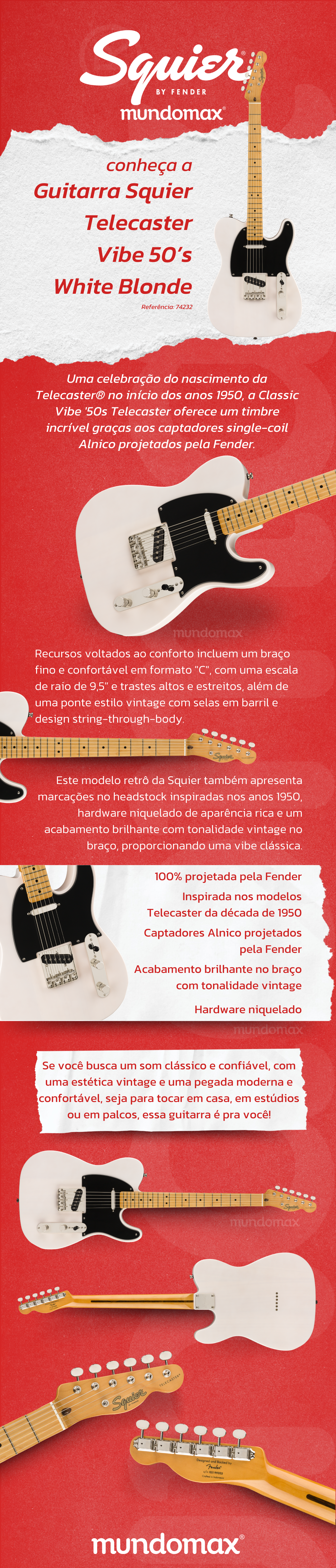 A Guitarra Squier Telecaster Vibe 50’s é uma celebração a uma das guitarras mais instantaneamente reconhecíveis do mundo, porém com alguns recursos modernos.