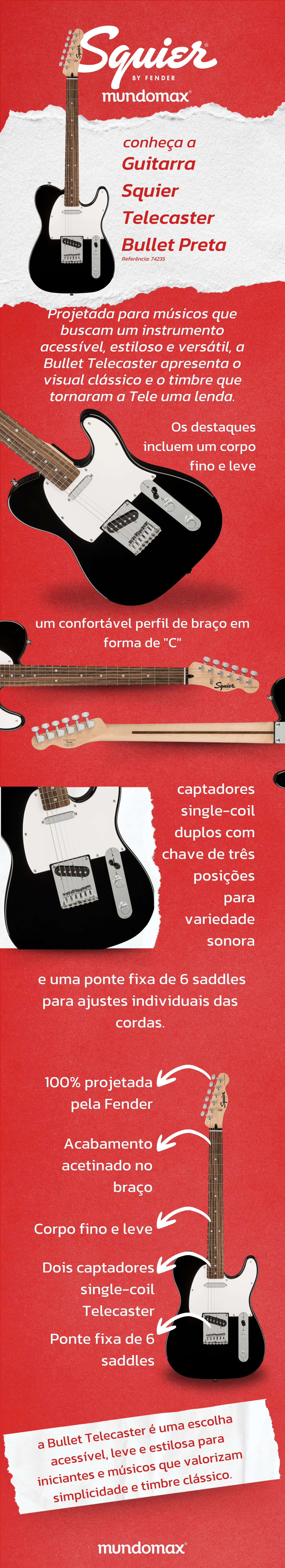 A Guitarra Squier Telecaster Bullet é um modelo projetado para músicos que procuram um instrumento acessível, elegante e versátil.