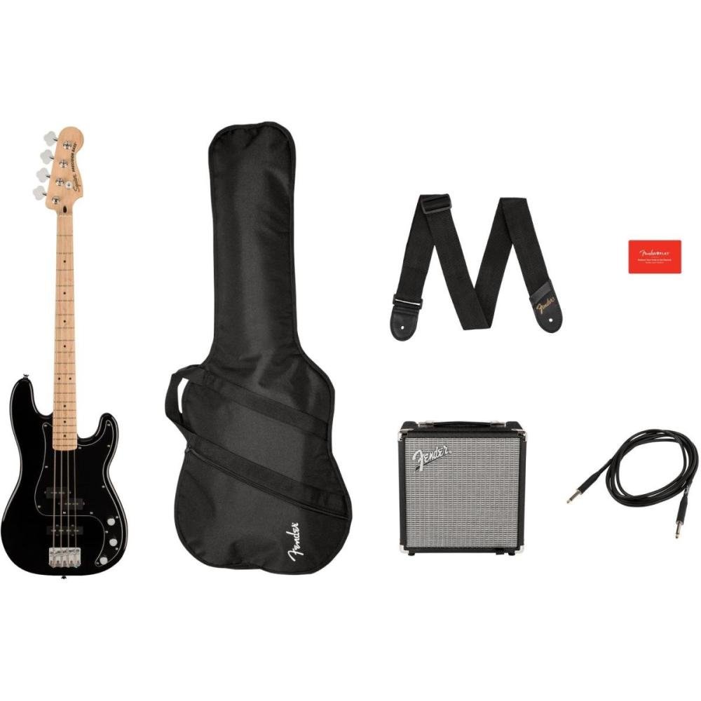 Um kit ideal para um músico de primeira viagem, composto por um Contrabaixo Squier, Amplificador Fender Rumble 15, uma Capa Acolchoada Fender, uma Correia Fender E Um Cabo de Instrumento Fender.