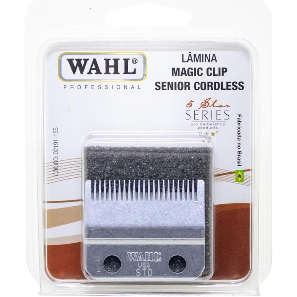 A Lâmina Magic Clip/Senior Cordless Wahl é um modelo cromado, compatível com máquinas Wahl magic clip com fio e senior cordless.