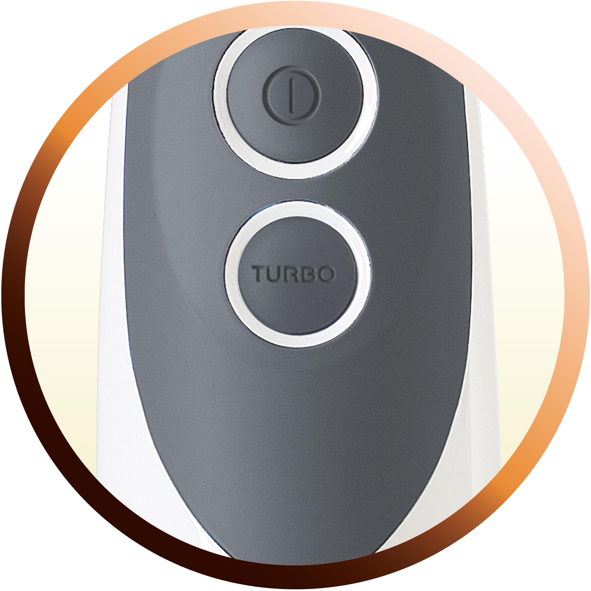 Possui lâmina com dupla ação que corta na horizontal e na vertical e botão turbo com potência extra para os ingredientes mais resistentes. Pode ser usado como miniprocessador para picar cebola, queijo, ervas e muito mais, além de bater para cremes, claras e maionese.