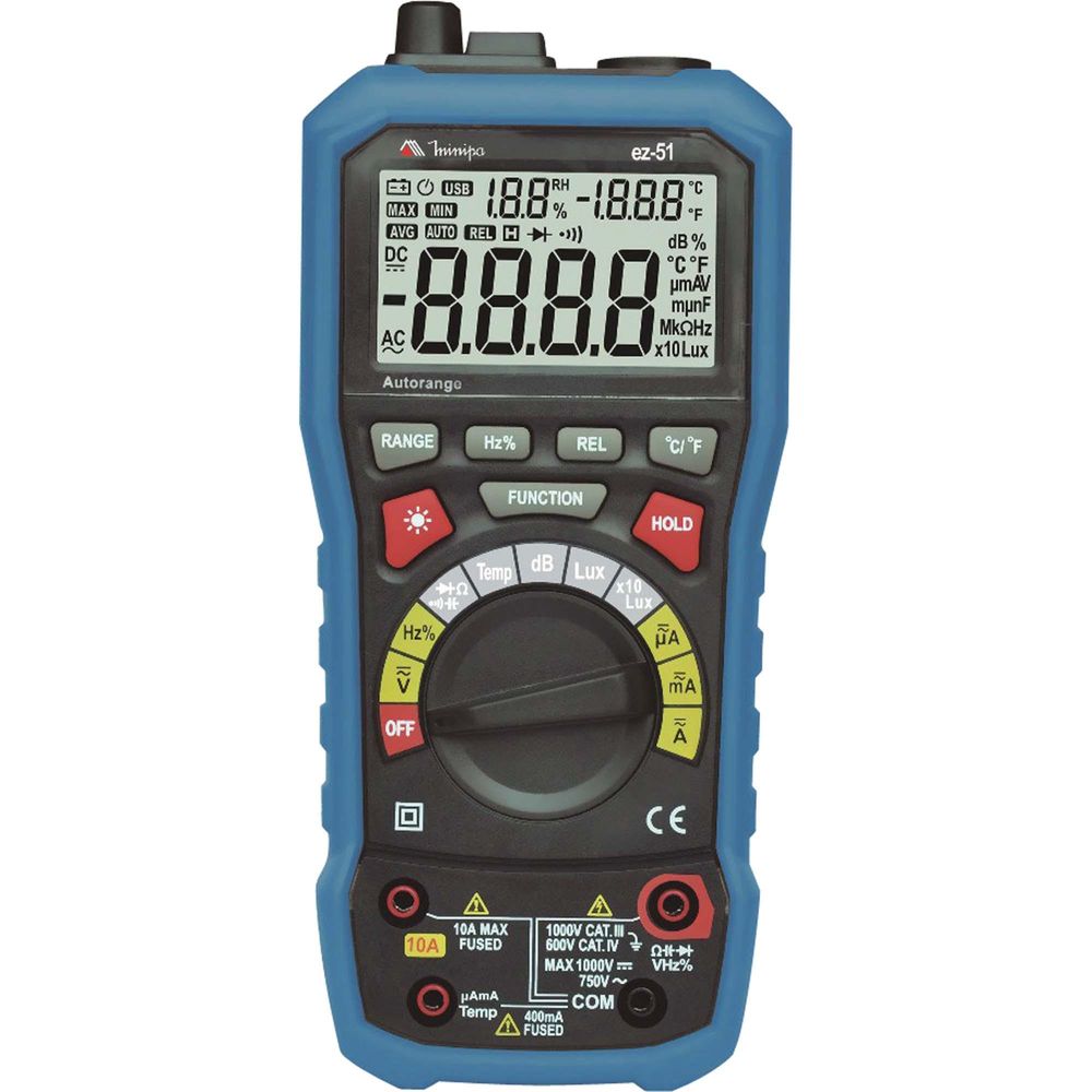 O EZ-51 é um aparelho 5 em 1 que possui as funções completas de um multímetro, como a tensão alternada contínua, resistência e capacitância e além disso, possui funções de Luxímetro, Decibelímetro, Termômetro e Higrômetro.