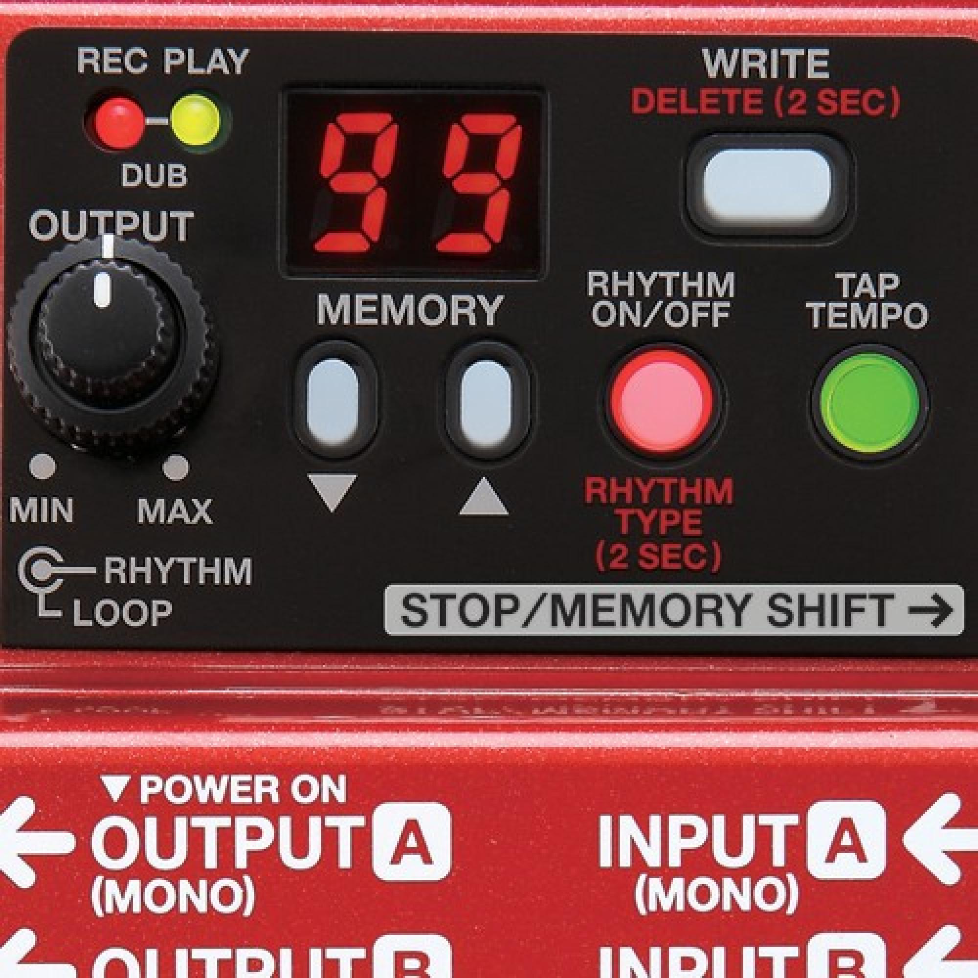 - Controles: Pedal switch LOOP OUTPUT, knob RHYTHM OUTPUT, knob DOWN, button UP, button WRITE, button RHYTHM ON/OFF, button TAP TEMPO;