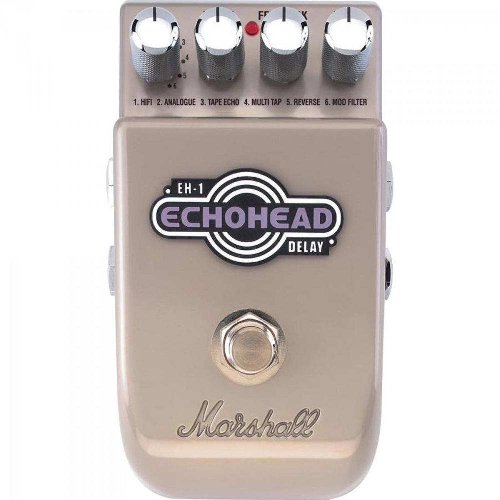 O EH-1 da Marshall cria desde ecos cristalinos até Delays reversos, passando pelo ruído de fundo típico dos Delays "retrô" de fita. Esse pedal cria sons pulsantes em sua guitarra e acrescenta texturas rítmicas densas  ao seu som. O EH-1 possui um tempo máximo de Delay de 2000 ms, saída estéreo e uma entrada para Tap Tempo. Além de saídas duplas que oferecem a opção de usar um Bypass passivo para o sinal principal, garantindo fidelidade tonal completa. EH-1 ECHOHEAD Descrição Desde ecos cristalinos até delays reversos, passando pelos delays vintage de fita. O Echohead recria seis tipos diferentes de Delay para a expressão da sua criatividade. Cria sons pulsantes em sua guitarra e acrescenta texturas rítmicas densas ao seu som. Possui um tempo máximo de Delay de 2000ms, saída estéreo e uma entrada para Tap Tempo. As saídas duplas oferecem a opção de usar um Bypass passivo para o caminho do sinal principal, garantindo a qualidade tonal.