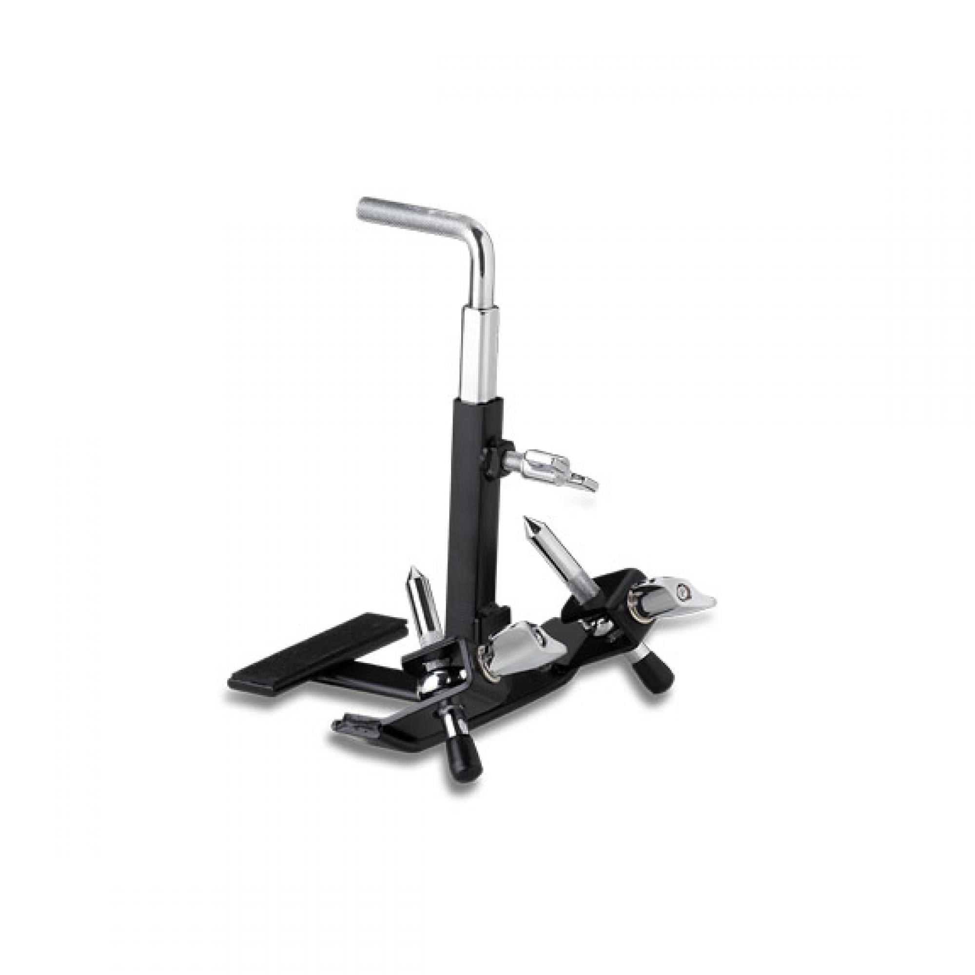 Tem regulagem de altura e âncora com lado pontiagudo ou borracha (para cada diferente situação). De um lado se fixa o pedal e na parte em "L"se fixa o acessório percussivo.